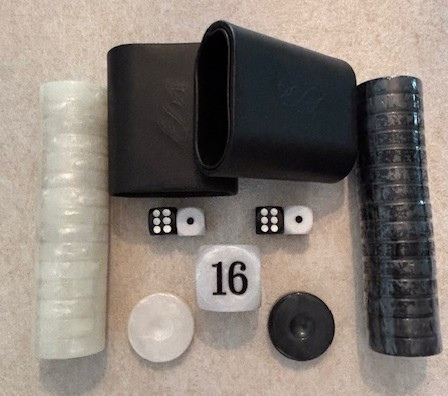 Beautiful complete Accessories set that includes 2 colors of marbled Black and White checkers (30 total), a pair of PU leather dice cups (lined inside and out, White Doubling Cube and 4 rounded corner dice for a consistant roll . Includes free shipping.