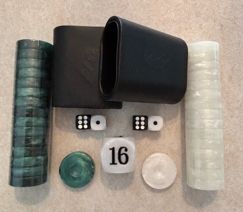 Beautiful complete Accessories set that includes 2 colors of Green and White marbled checkers (30 total), a pair of PU leather dice cups (lined inside and out, Pearl White Doubling Cube and 4 rounded corner dice for a consistant roll . Includes free shipping.