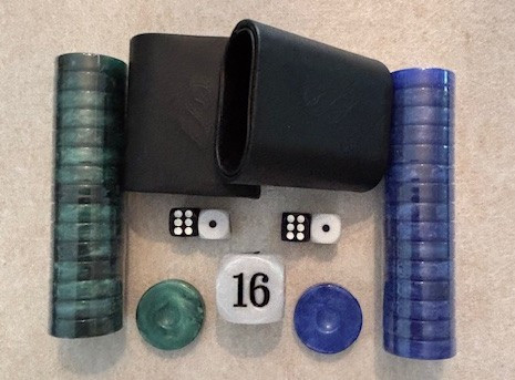 Beautiful complete Accessories set that includes 2 colors of marbled Navy and Green checkers (30 total), a pair of PU leather dice cups (lined inside and out, White Doubling Cube and 4 rounded corner dice for a consistant roll . Includes free shipping.