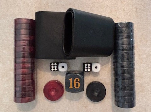 Beautiful complete Accessories set that includes 2 colors of Red and Black marbled checkers (30 total), a pair of PU leather dice cups (lined inside and out, Pearl Black Doubling Cube and 4 rounded corner dice for a consistant roll . Includes free shipping.