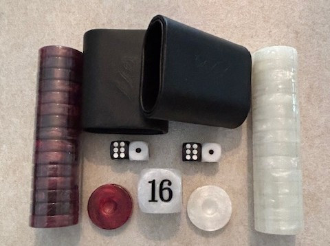Beautiful complete Accessories set that includes 2 colors of Red and White marbled checkers (30 total), a pair of PU leather dice cups (lined inside and out, Pearl White Doubling Cube and 4 rounded corner dice for a consistant roll . Includes free shipping.
